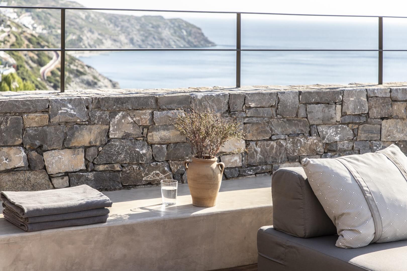וילה זו היא בית מודרניסטי שנבנה לאחרונה, ממש ליד העיירה ההומה הרקליון ובמרחק של 10 דקות נסיעה מהחוף הקרוב ביותר. יושבת על מדרון עם נוף מרהיב לים, הווילה עם 3 חדרי שינה מתגאה בחלל חיצוני אופנתי המאובזר במלואו למגורים בחוץ - יש טרקלין ופינות אוכל מוצלות בפרגולה, מטבח חיצוני עם ברביקיו, פטיו מרופדים במדשאה ומרפסת מרהיבה. בריכת אינסוף, כולן פונה לפנורמה. הבית בנוי בשני מפלסים כדי למקסם הן את השטח הפנוי והן את הנוף. הדגשים של עץ ואבן משמשים כדי להפחית את הגיאומטריה הנועזת של המבנה ולחבר אותו לתפאורה שלו. המפלס העליון נפתח למרפסת נוחה שנראית כאילו היא צפה מעל הים. בתוך הבית, דפוס החומרים חוזר על עצמו כדי לשקף את החוץ. אזורי המגורים מרווחים ואווריריים, לבושים בגוונים שקטים ומצוידים בריהוט מעצבים בקווים מודרניסטיים. למרות הגיאומטריה הנקייה והעיצוב המוקפד שלו, הפנים מרגישים נינוח וחמים, מה שמוכיח שניתן להעמיד עיצוב נהדר - כאשר הוא מבוצע במומחיות - לשירות הנוחות. ברחבי הבית יש חלונות -לעיתים רחבים ואחרים צרים, בהתאם לכיוון שלהם - הממסגרים נופים נאים של הסביבה הטבעית. חדרי השינה ממוקמים במפלס העליון כדי להציע יותר פרטיות. ריצוף העץ, הריפוד העשיר והפריטים המעוצבים יוצרים אווירה שהיא בו זמנית נוחה ומפנקת. הוילה שופצה בפנים ובחוץ ביולי 2020 וצילום חדש מתוכנן בקרוב