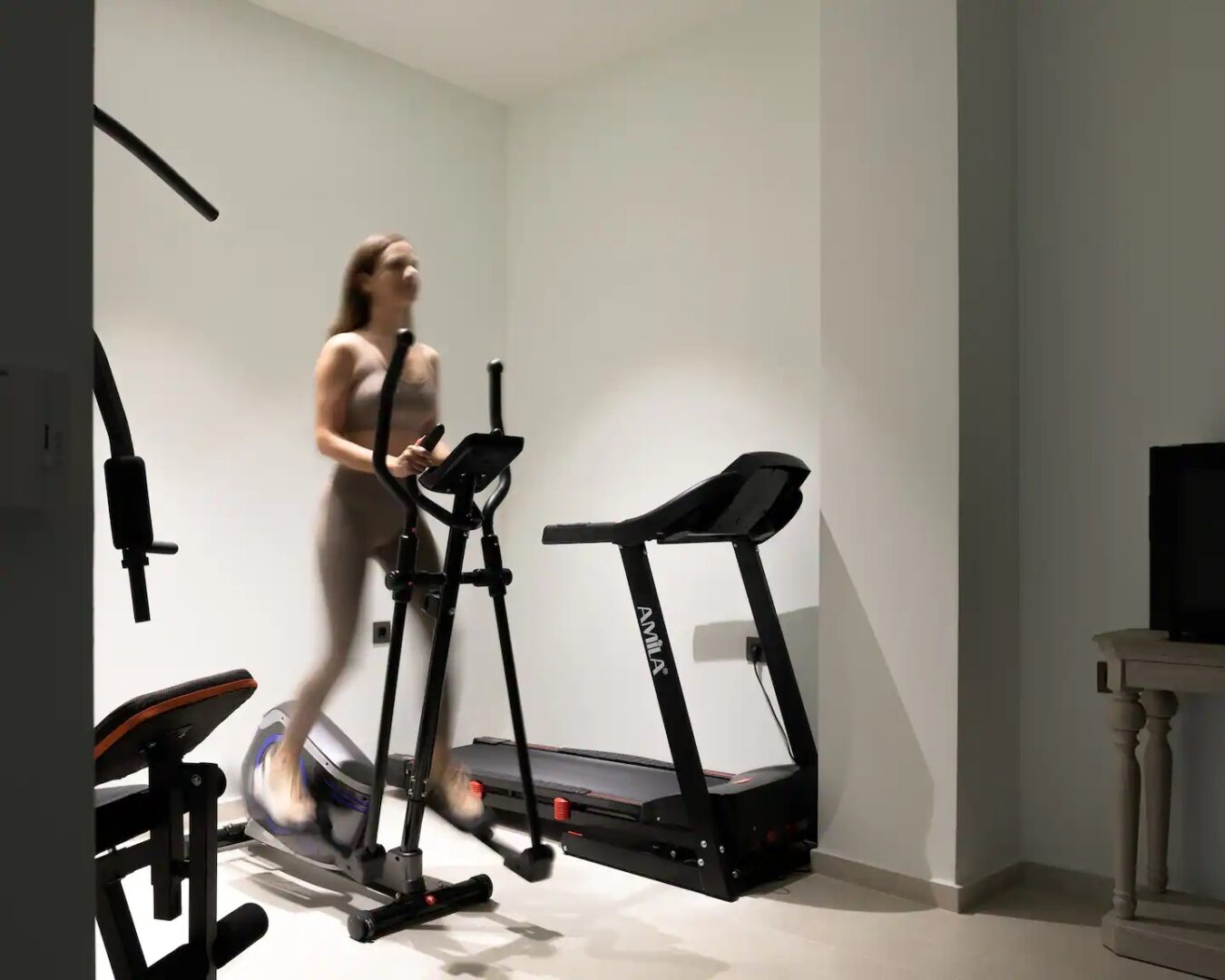 חדר שינה עם מיטת קינג סייז (1,80x2,00), טלוויזיה חכמה 32'', דלת וחלון מרפסת • חדר שינה עם מיטת קומותיים, מואר באור טבעי מהחלון, טלוויזיה חכמה 32'' • חדר רחצה משותף עם תא מקלחת • חדר כושר (כולל הליכון, אופני כושר נייחים, מכשיר רב תחנות) • קולנוע ביתי (מקרן, 4 רמקולים, מקרר/מקרר תצוגת יין) • חדר כביסה.