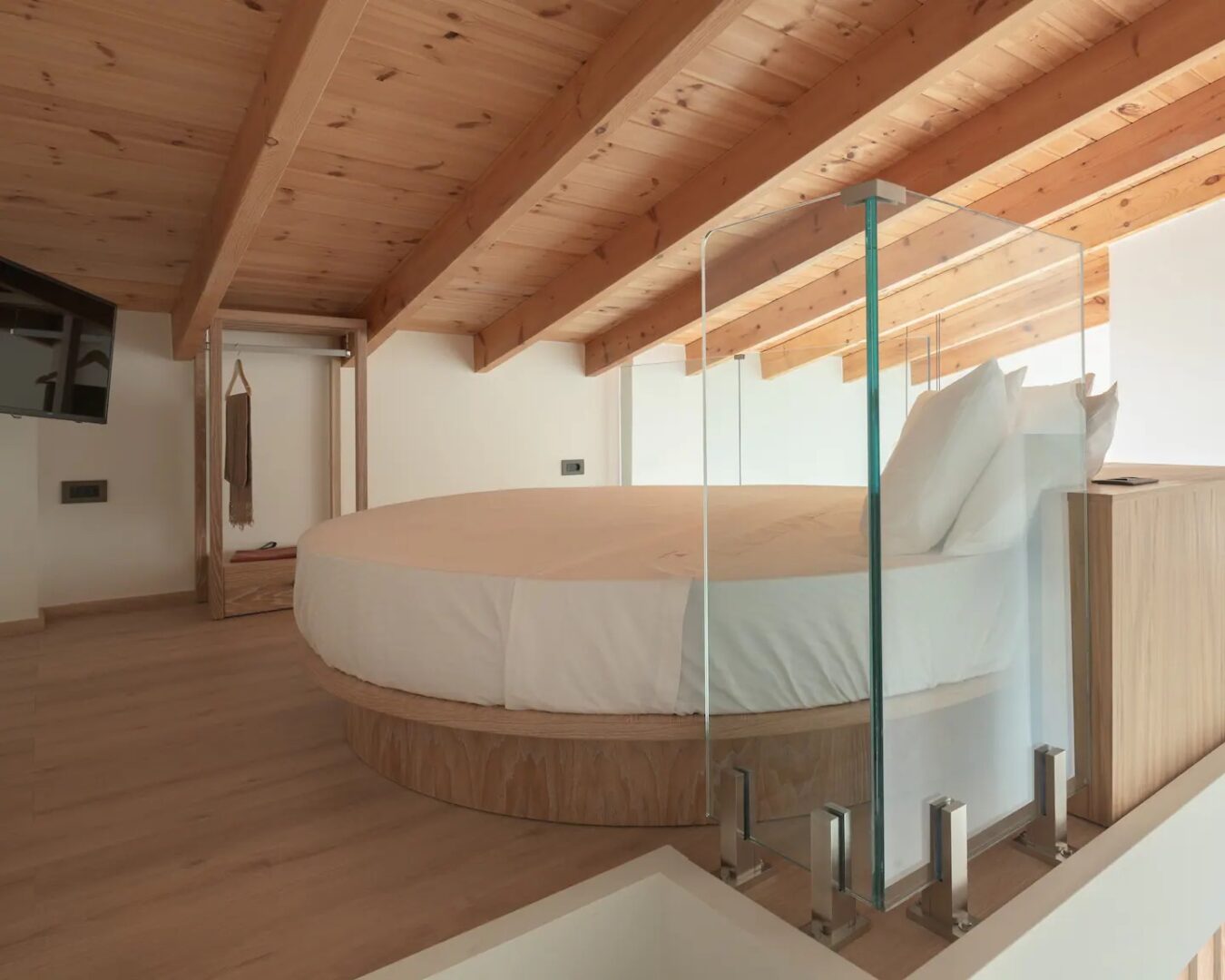 מטבח, פינת אוכל, סלון הכולל טלוויזיה חכמה 55 אינץ', גישה למרפסת דרך דלתות המרפסת • חדר שינה עם מיטת קינג סייז (1,80x2,00), טלוויזיה חכמה 32 אינץ', גישה למרפסת • חדר רחצה משותף עם מקלחת בקתה • (בקומה העליונה) סוג עליית גג פתוחה - חדר שינה זוגי בצורת עגול, טלוויזיה חכמה 32''.